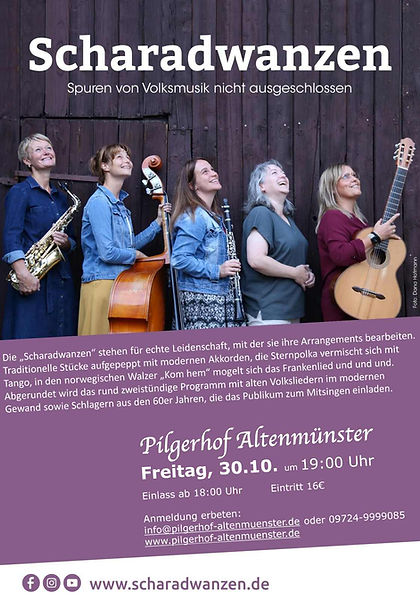 Die "Scharadwanzen" stehen für echte Leidenschaft, mit der sie ihre Arrangements bearbeiten. Traditionelle Stücke aufgepeppt mit modernen Akkorden, die Sternpolka vermischt sich mit Tango, in den norwegischen Walzer "Kom hem" mogelt sich das Frankenlied und und und. Abgerundet wird das rund zweistündige Programm mit alten Volksliedern im moderen Gewand sowie Schlagern aus den 60er Jahren, die das Publikum zum Mitsingen einladen.